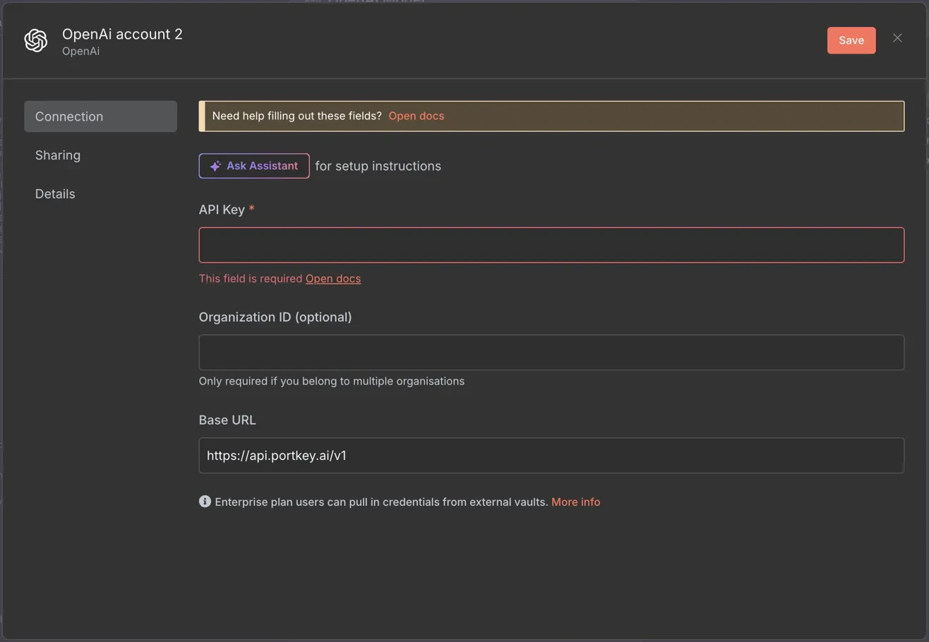 Select your provider (OpenAI, Anthropic, etc.), enter your API key, and create a slug like openai-prod.