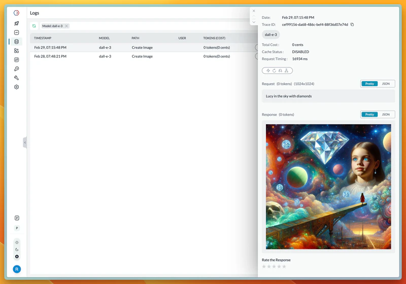 On completion, the request will get logged in the logs UI where the image can be viewed. (Note that providers may remove the hosted image after a period of time, so some logs might only contain the url)