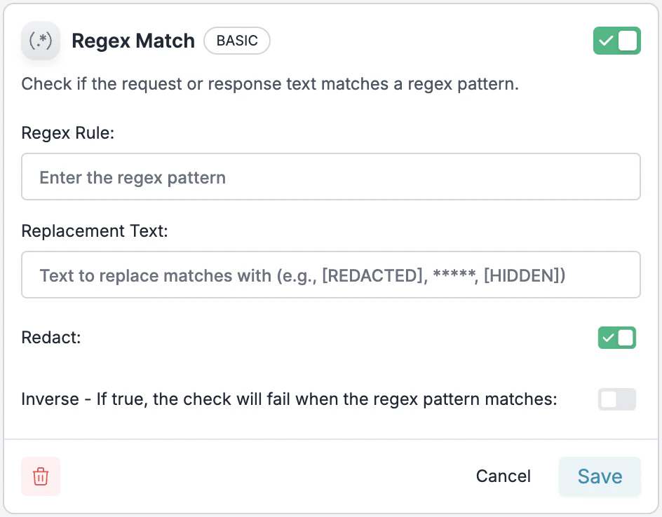 - Regex Rule: Enter your regex pattern to match specific PII (e.g.,